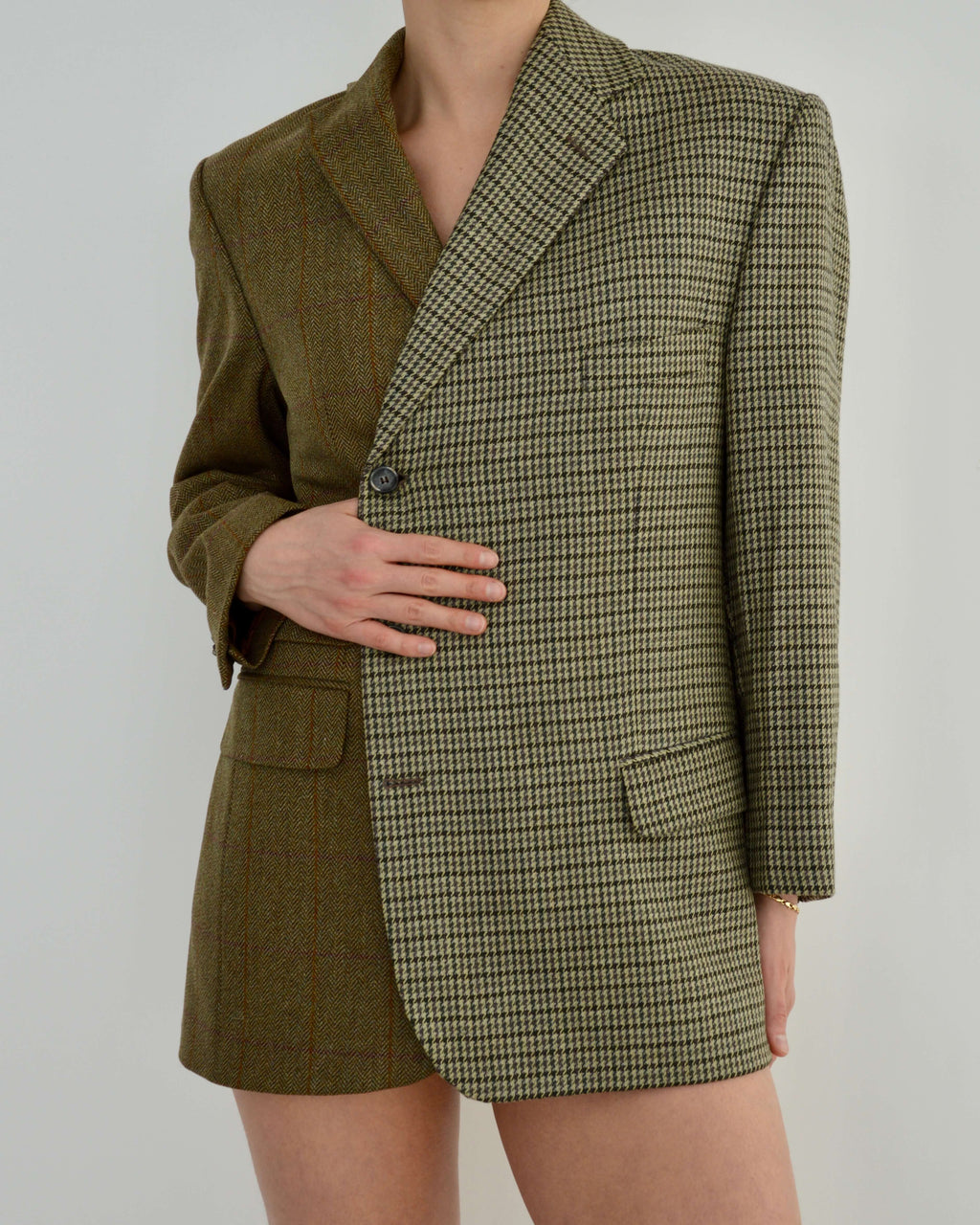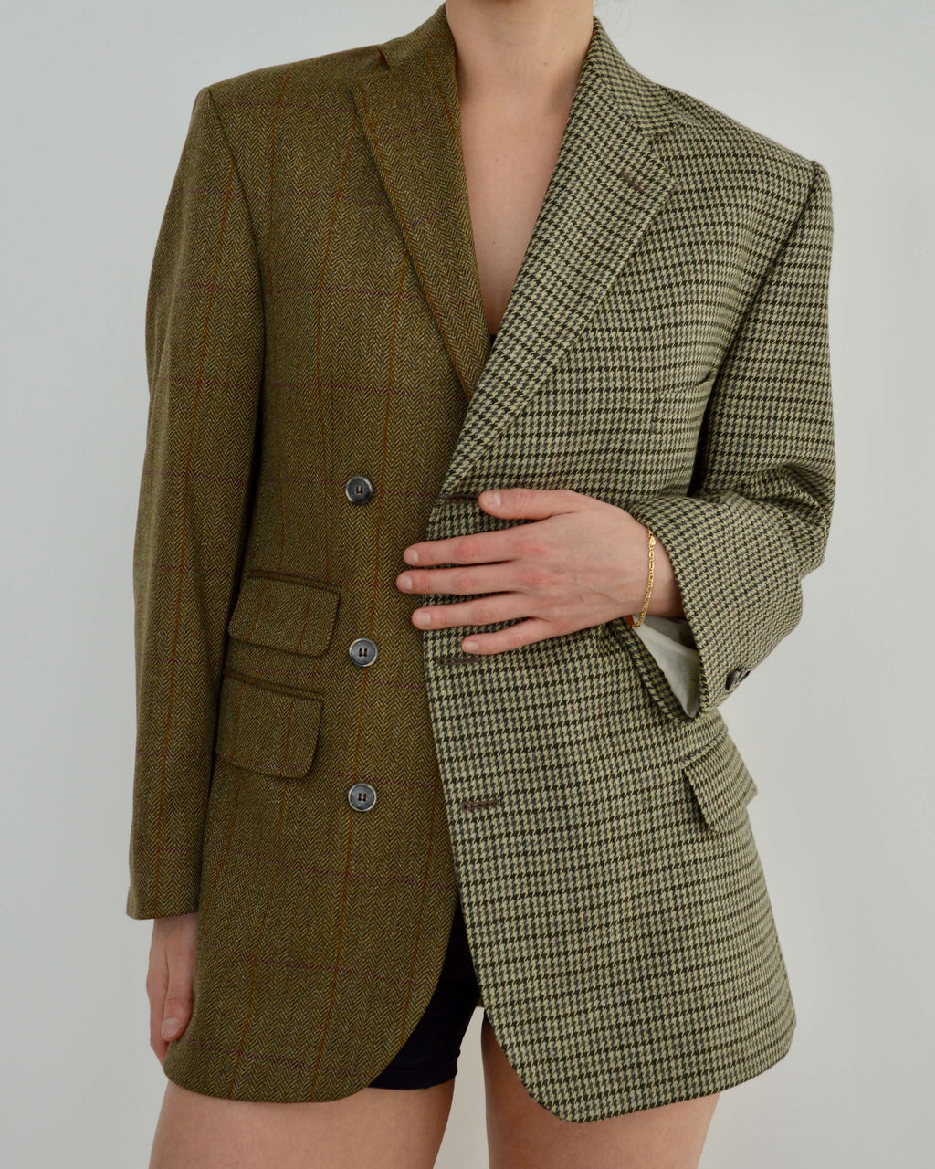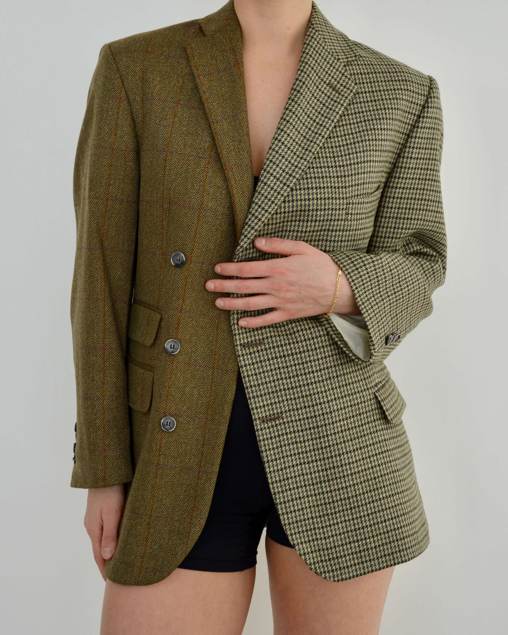 Blazer unique, confectionné à la main à partir d'un costume d'homme existant, combinant deux vestes vintage pour obtenir le produit final. Veuillez noter que notre blazer DUO est conçu pour une coupe oversize, puisqu'il s'agit à l'origine d'un vêtement masculin.