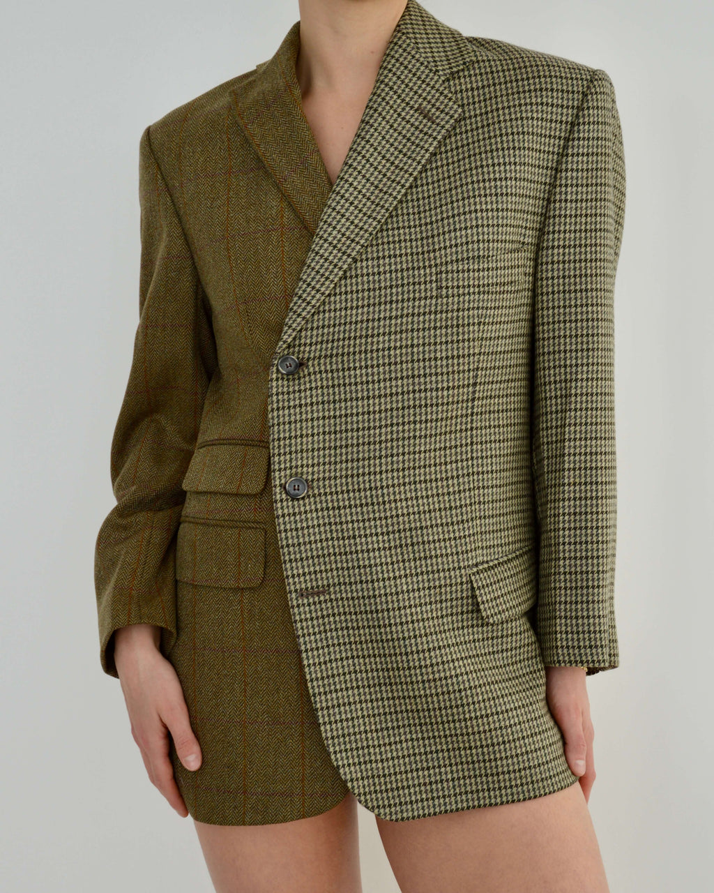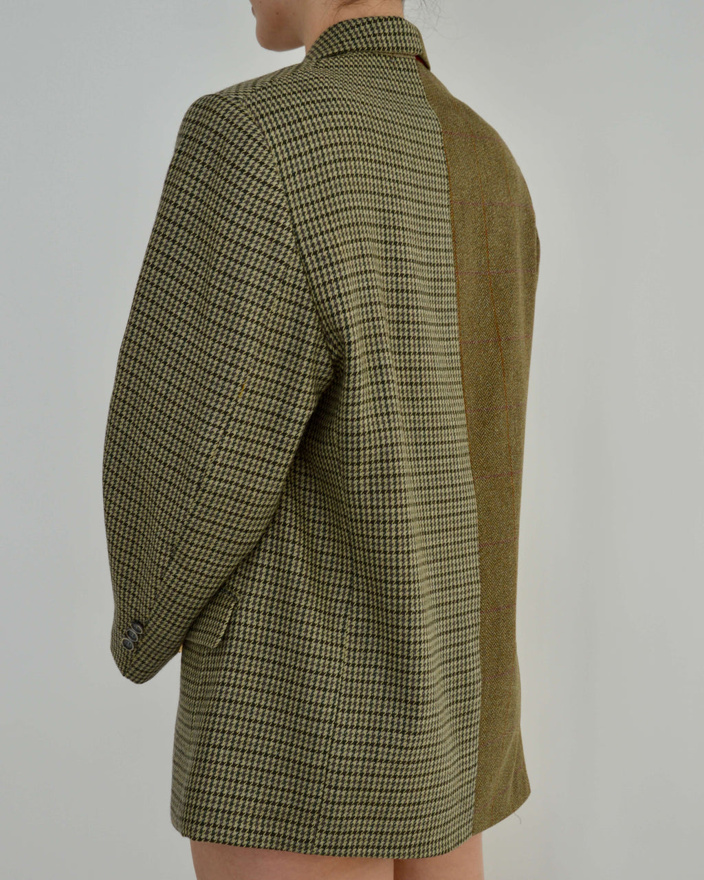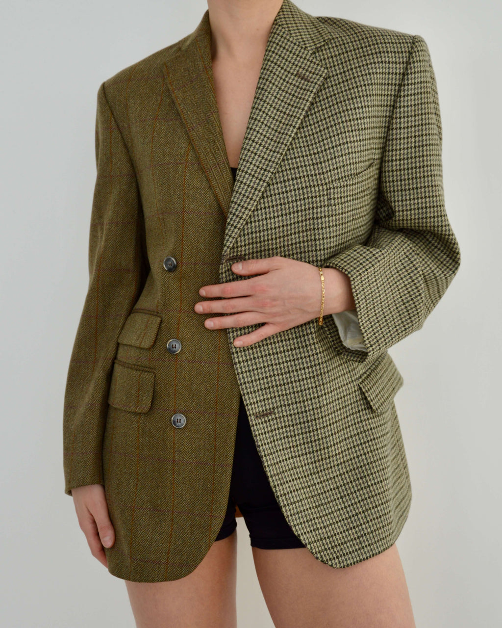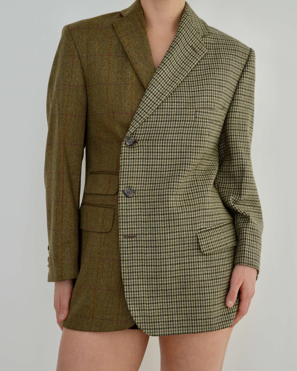 Blazer unique, confectionné à la main à partir d'un costume d'homme existant, combinant deux vestes vintage pour obtenir le produit final. Veuillez noter que notre blazer DUO est conçu pour une coupe oversize, puisqu'il s'agit à l'origine d'un vêtement masculin.