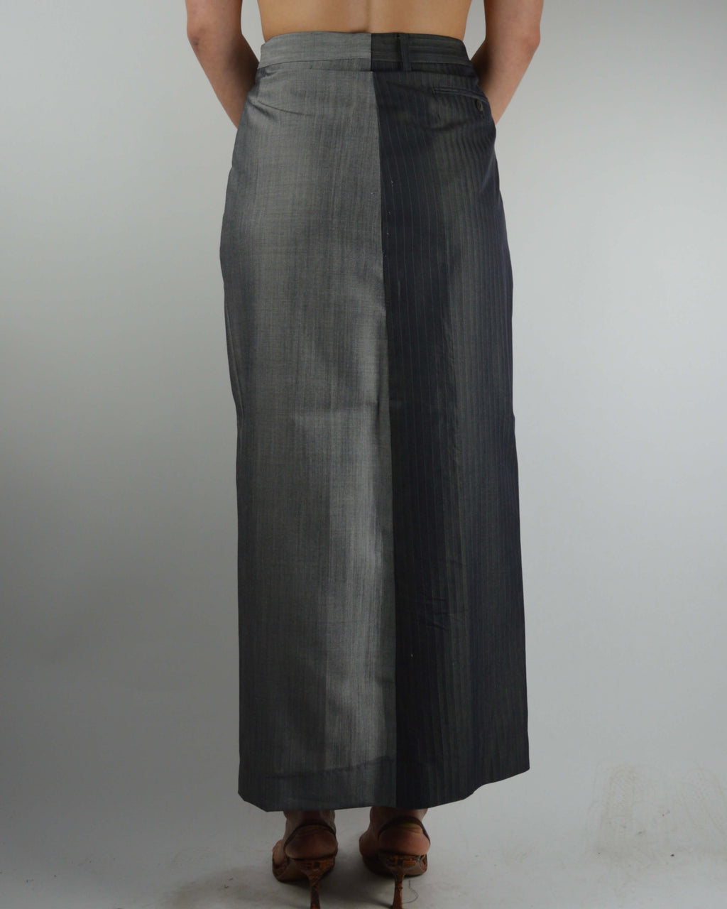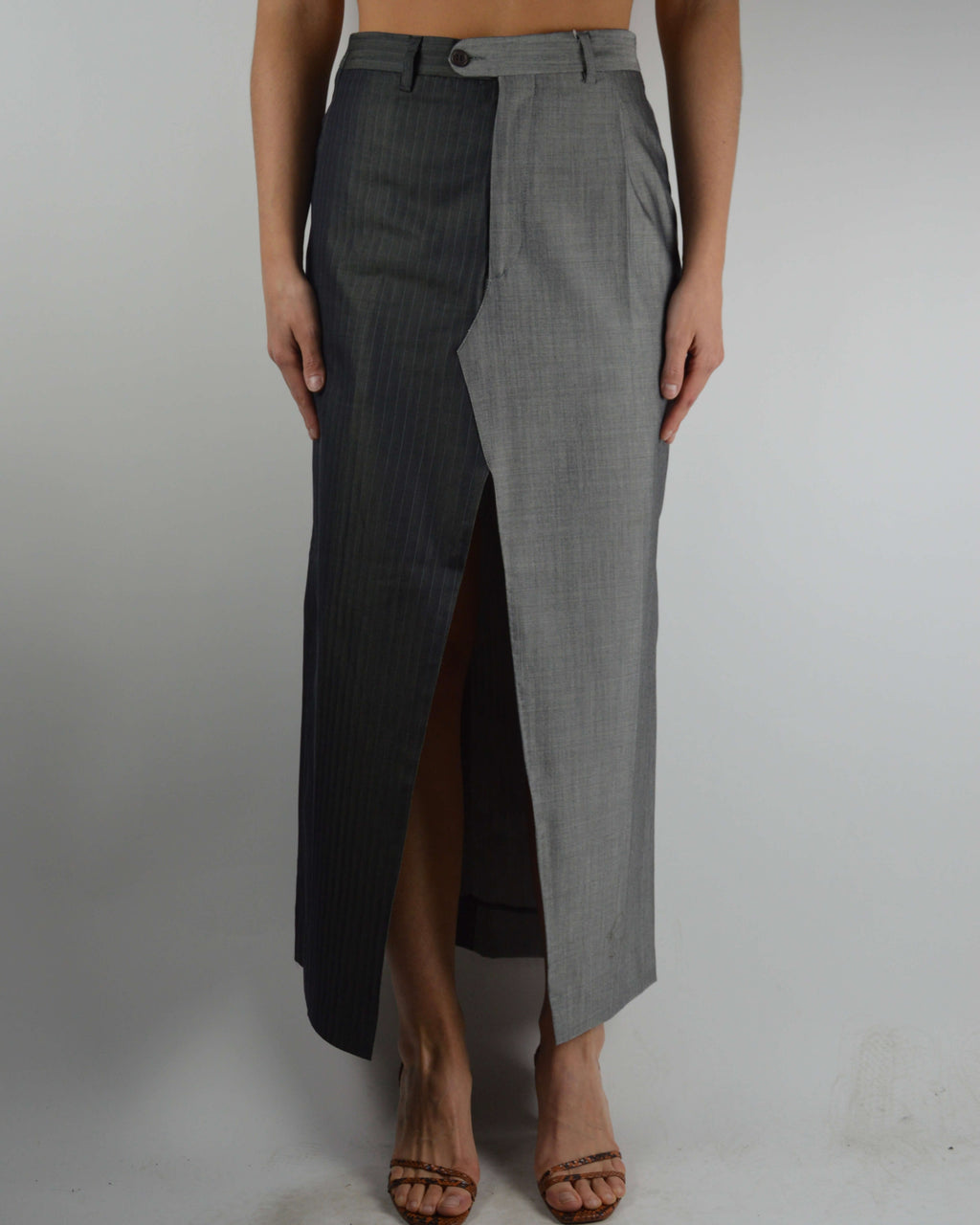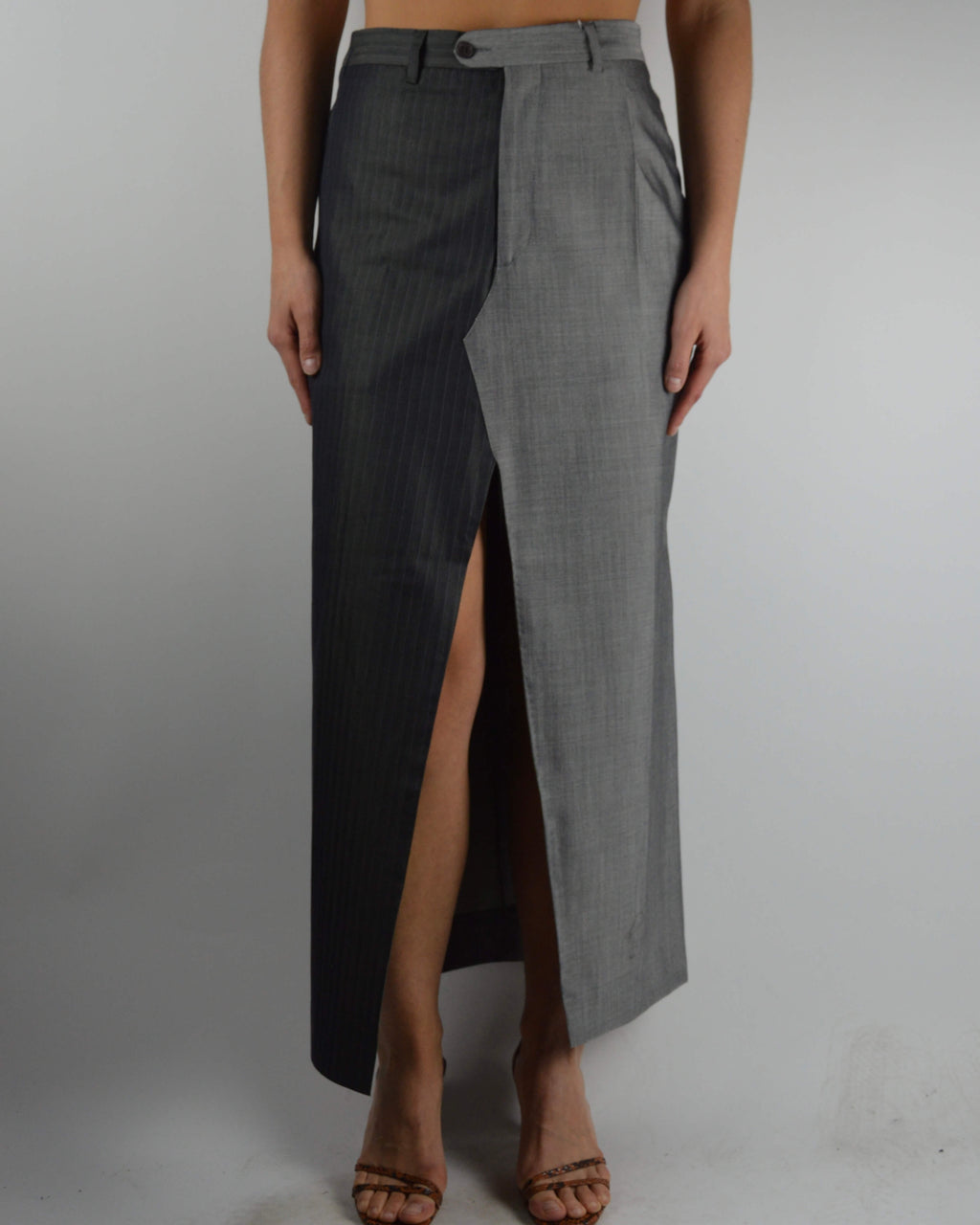 Jupe 1/1 upcyclée à partir d'un pantalon d'homme. Ouverture sur le devant pour un confort optimal.