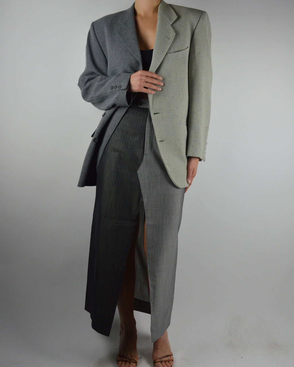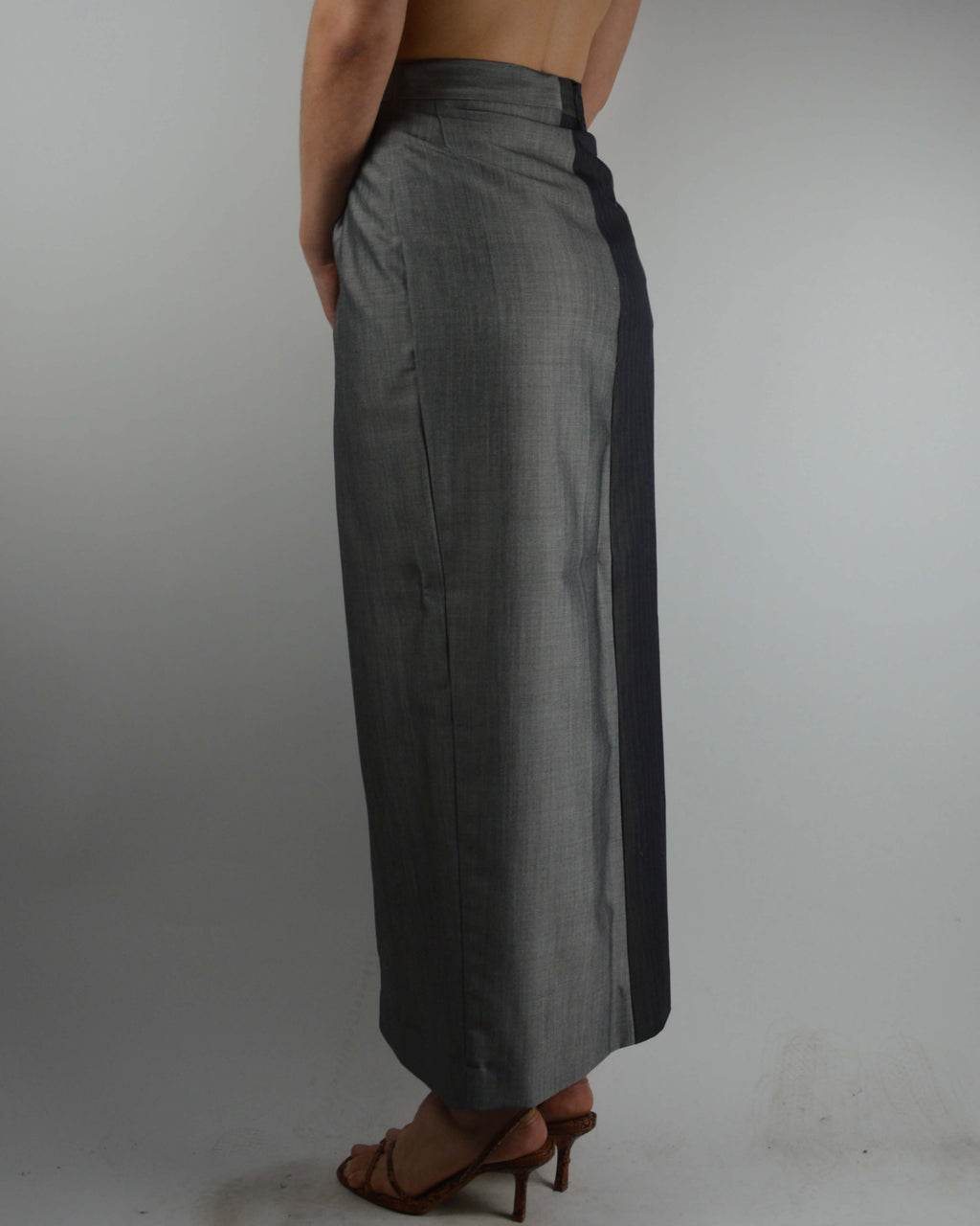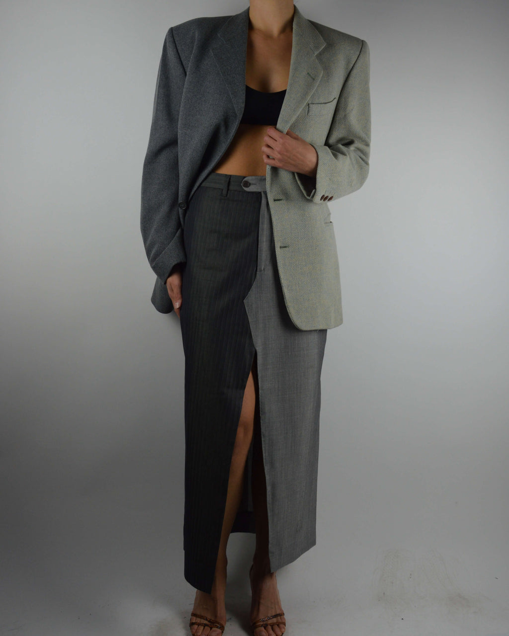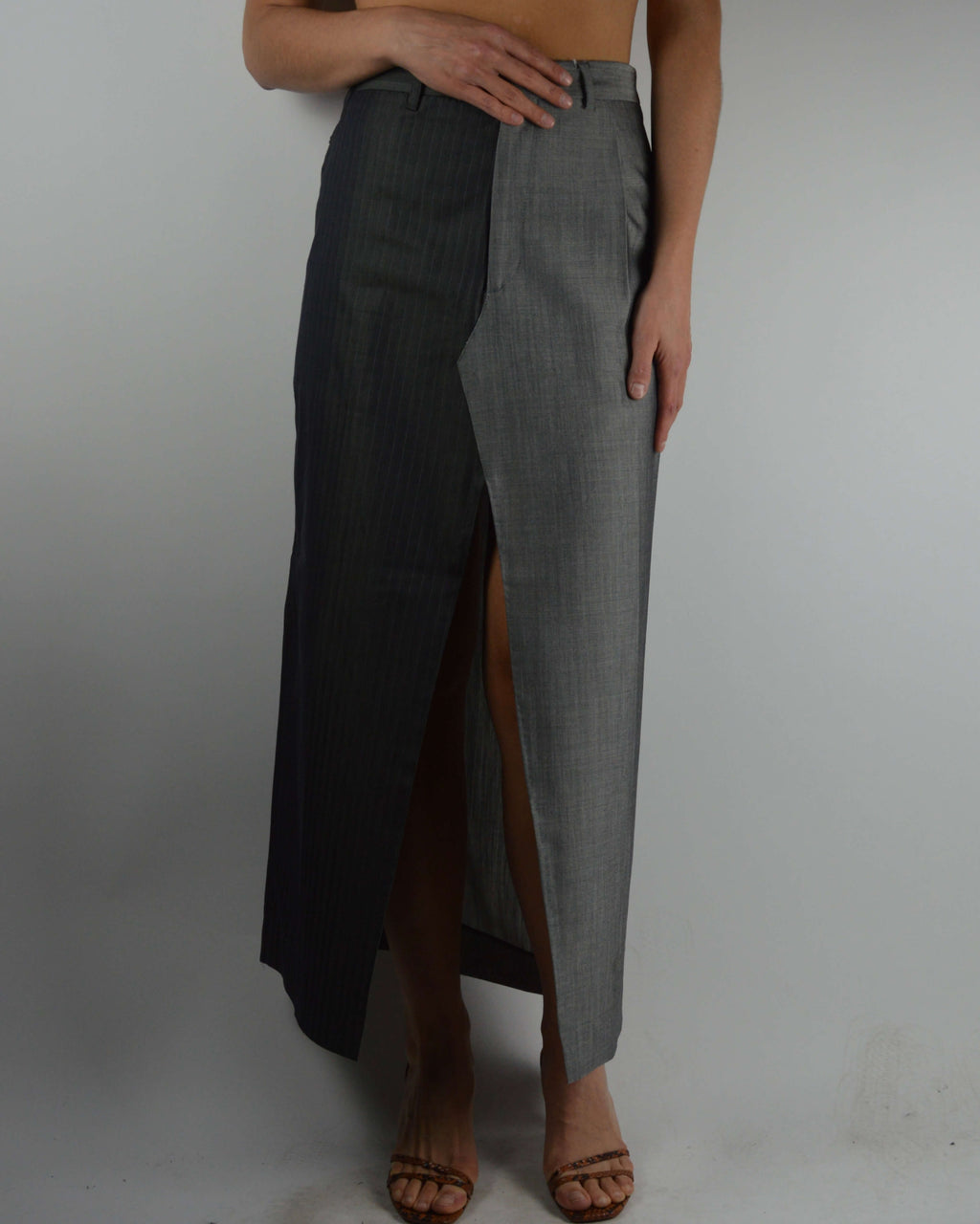 Jupe 1/1 upcyclée à partir d'un pantalon d'homme. Ouverture sur le devant pour un confort optimal.