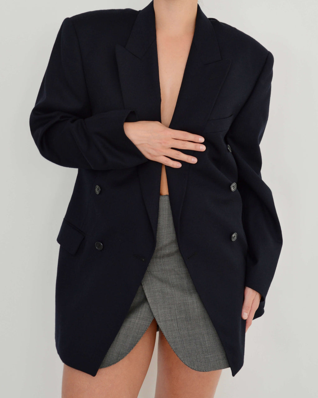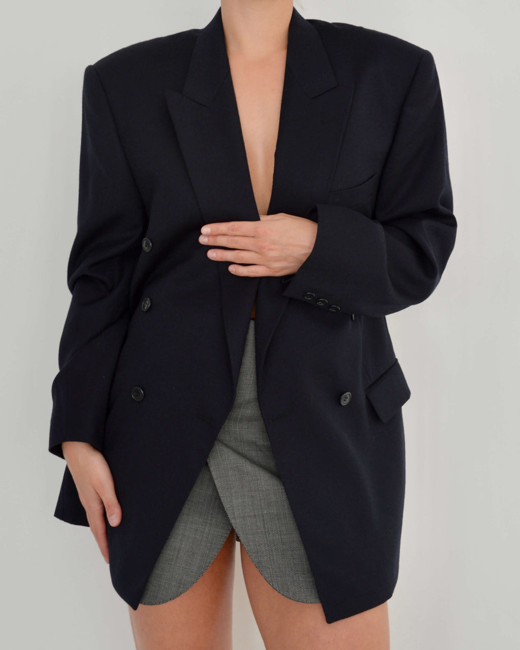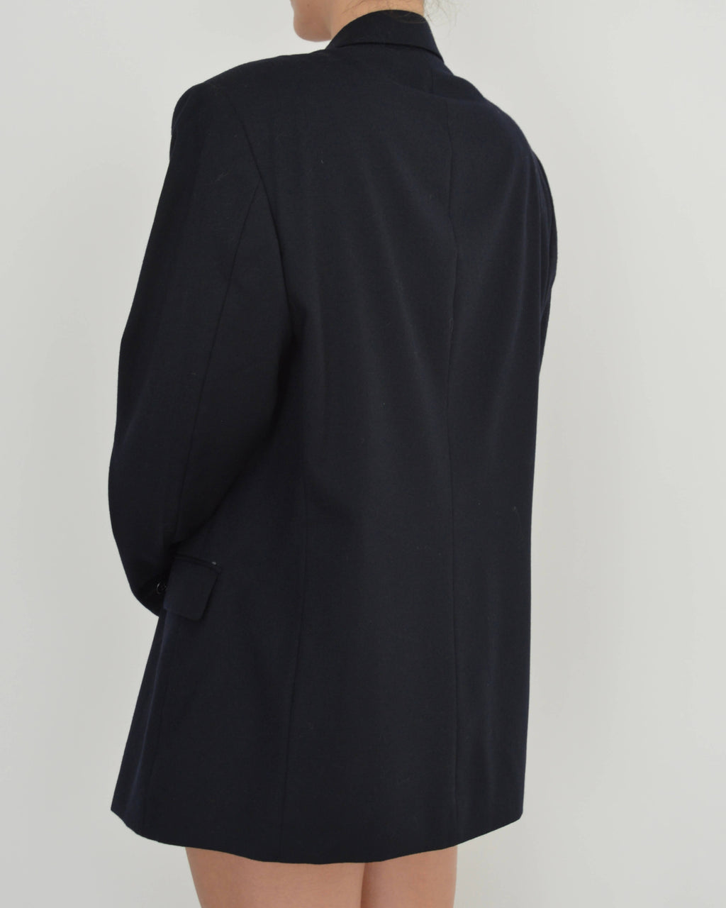 Blazer d'hiver oversize bleu marine foncé. Fermeture croisée à six boutons.