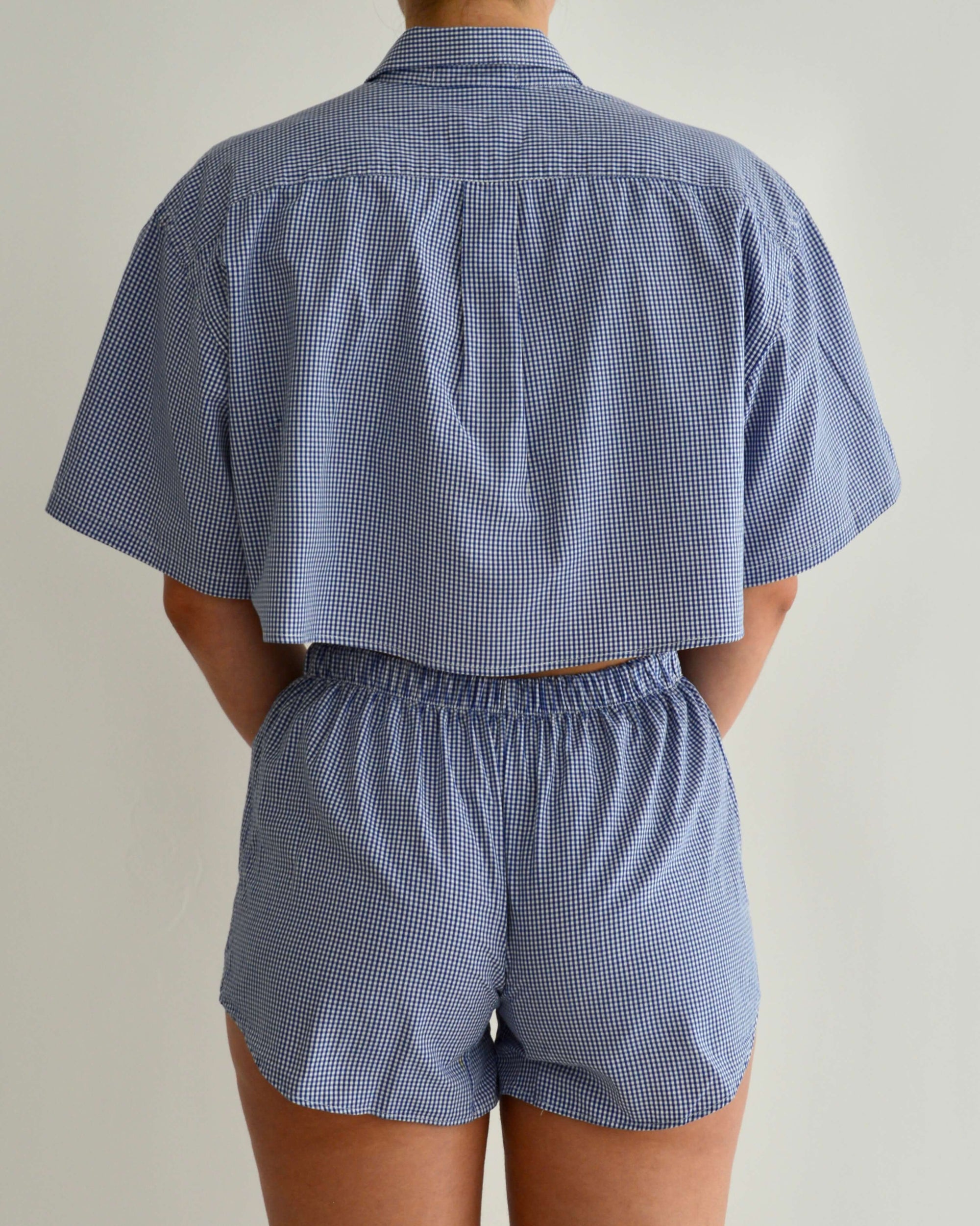 Ensemble unique, confectionné à la main à partir d'une chemise d'homme transformée en un ensemble deux pièces. Le blazer court est conçu pour une coupe oversize, inspirée des modèles de costumes masculins d'origine.