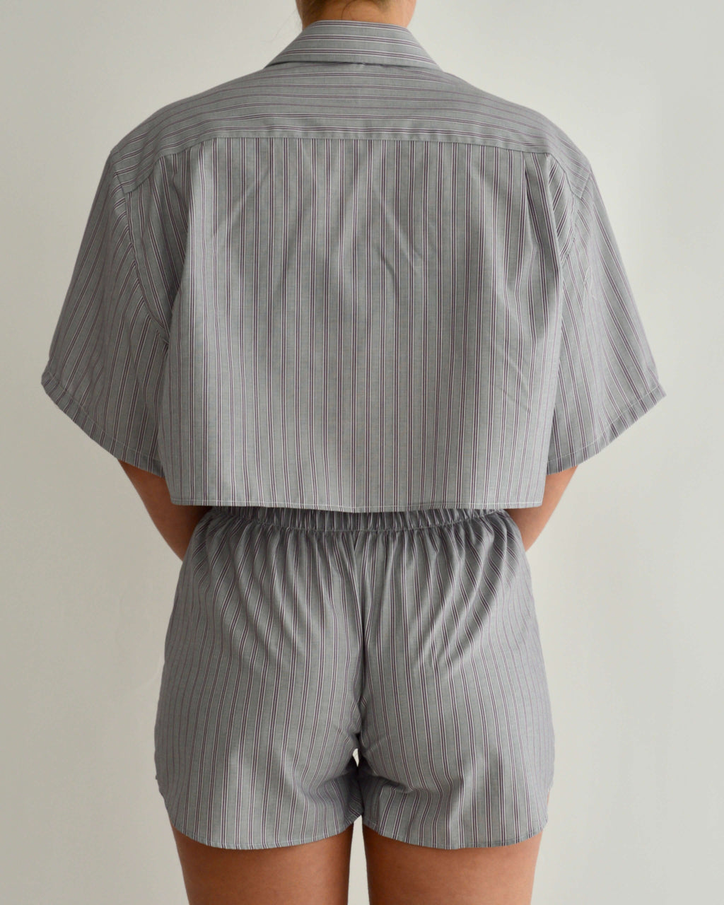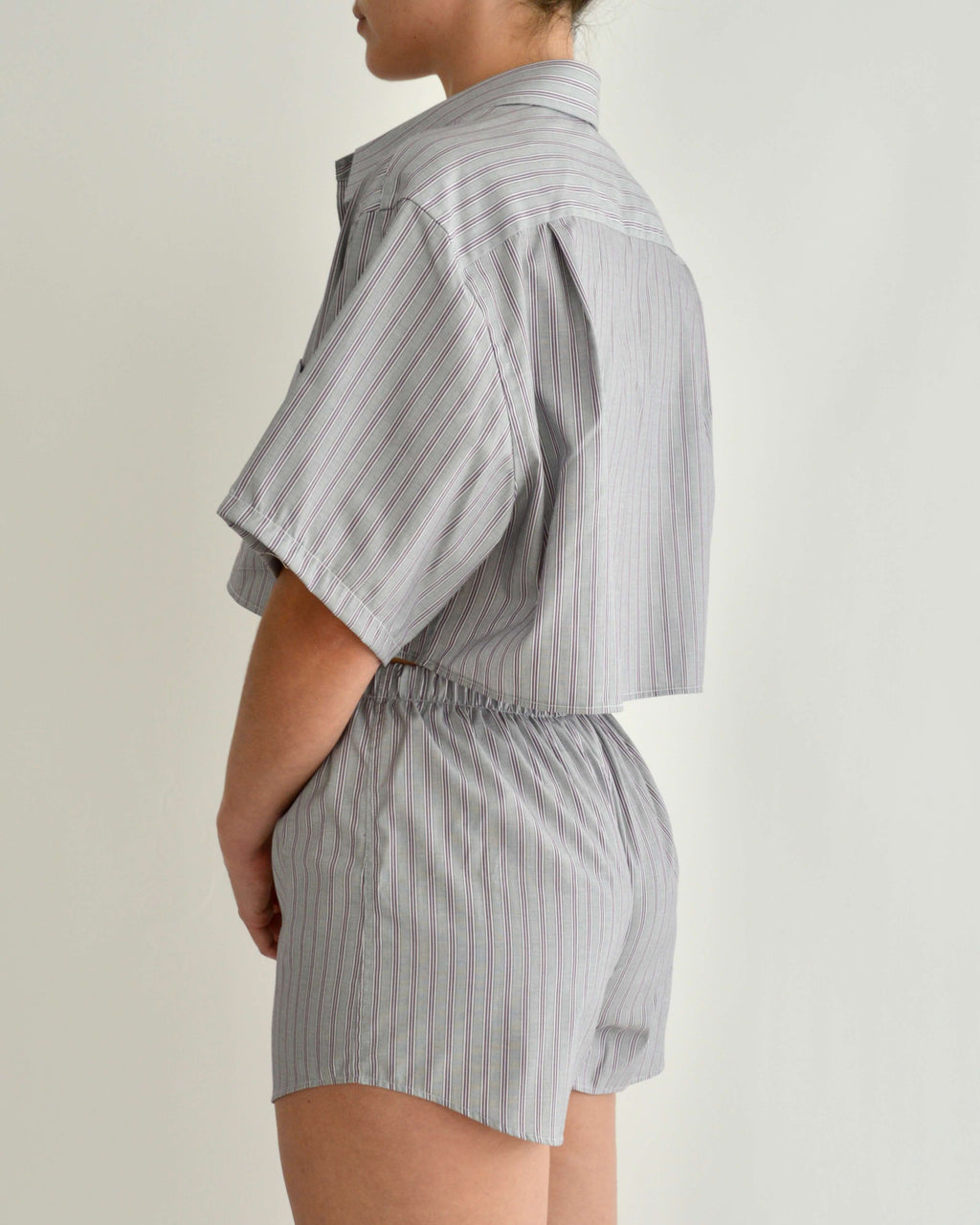 Ensemble unique, confectionné à la main à partir d'une chemise d'homme transformée en un ensemble deux pièces. Le blazer court est conçu pour une coupe oversize, inspirée des modèles de costumes masculins d'origine.