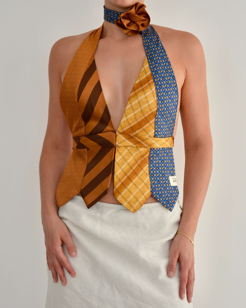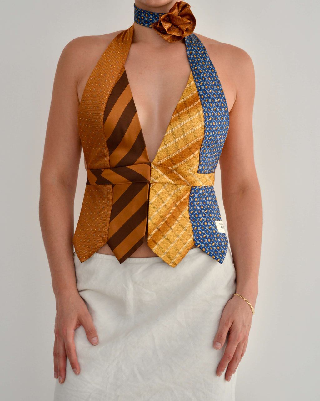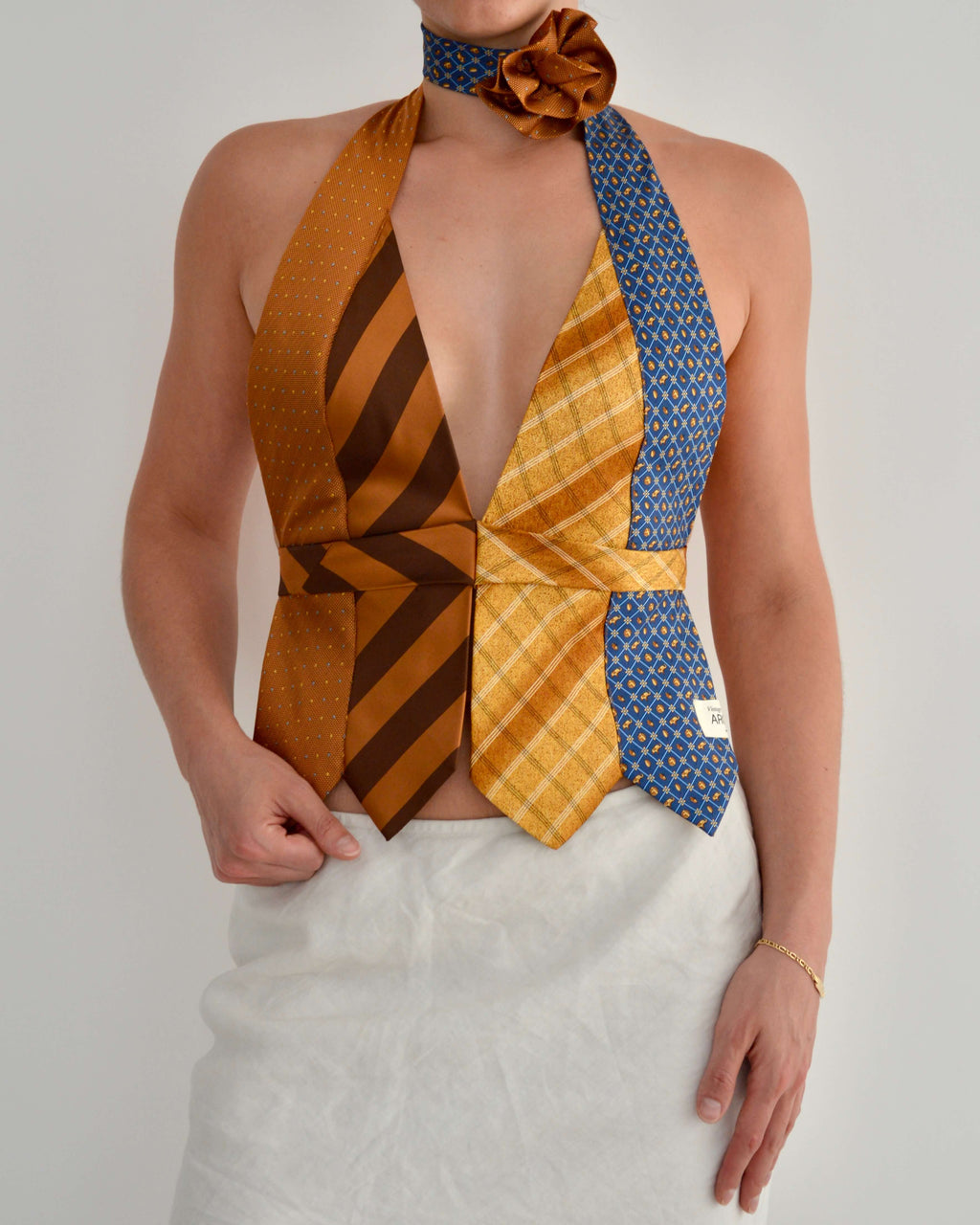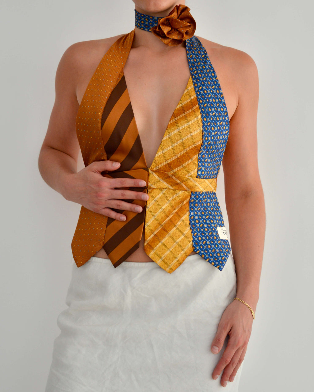 Cravate unique et ras-de-cou fleuri, confectionnés à la main à partir de quatre cravates existantes.