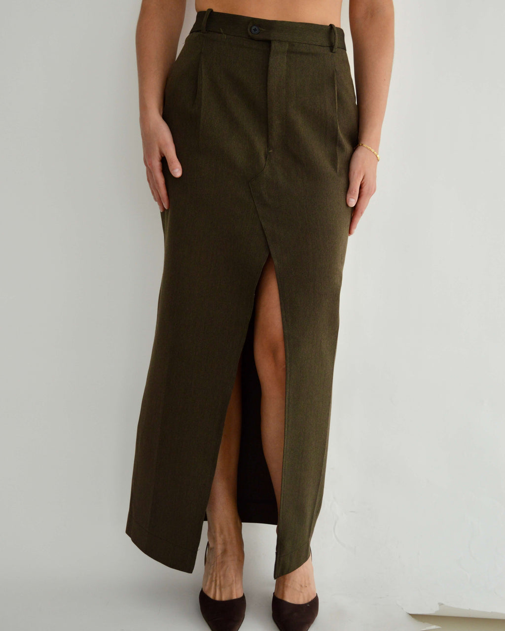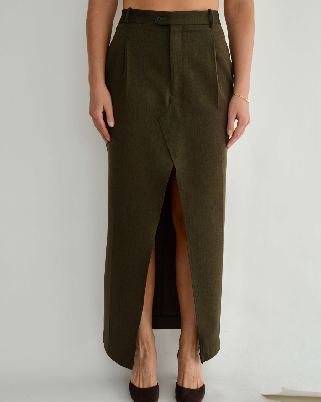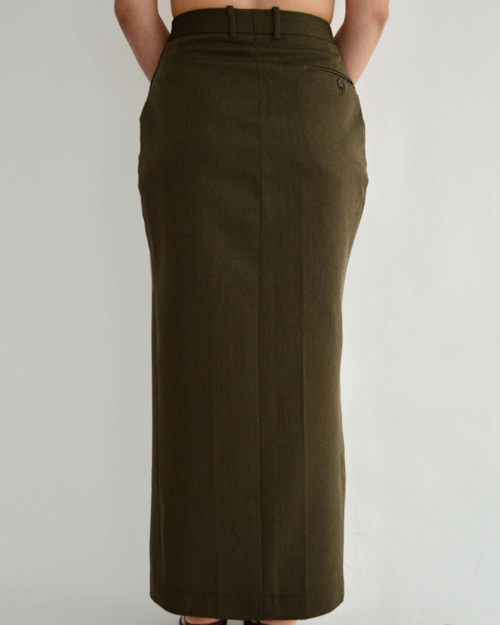 Jupe 1/1 upcyclée à partir d'un pantalon d'homme. Ouverture sur le devant pour un confort optimal.