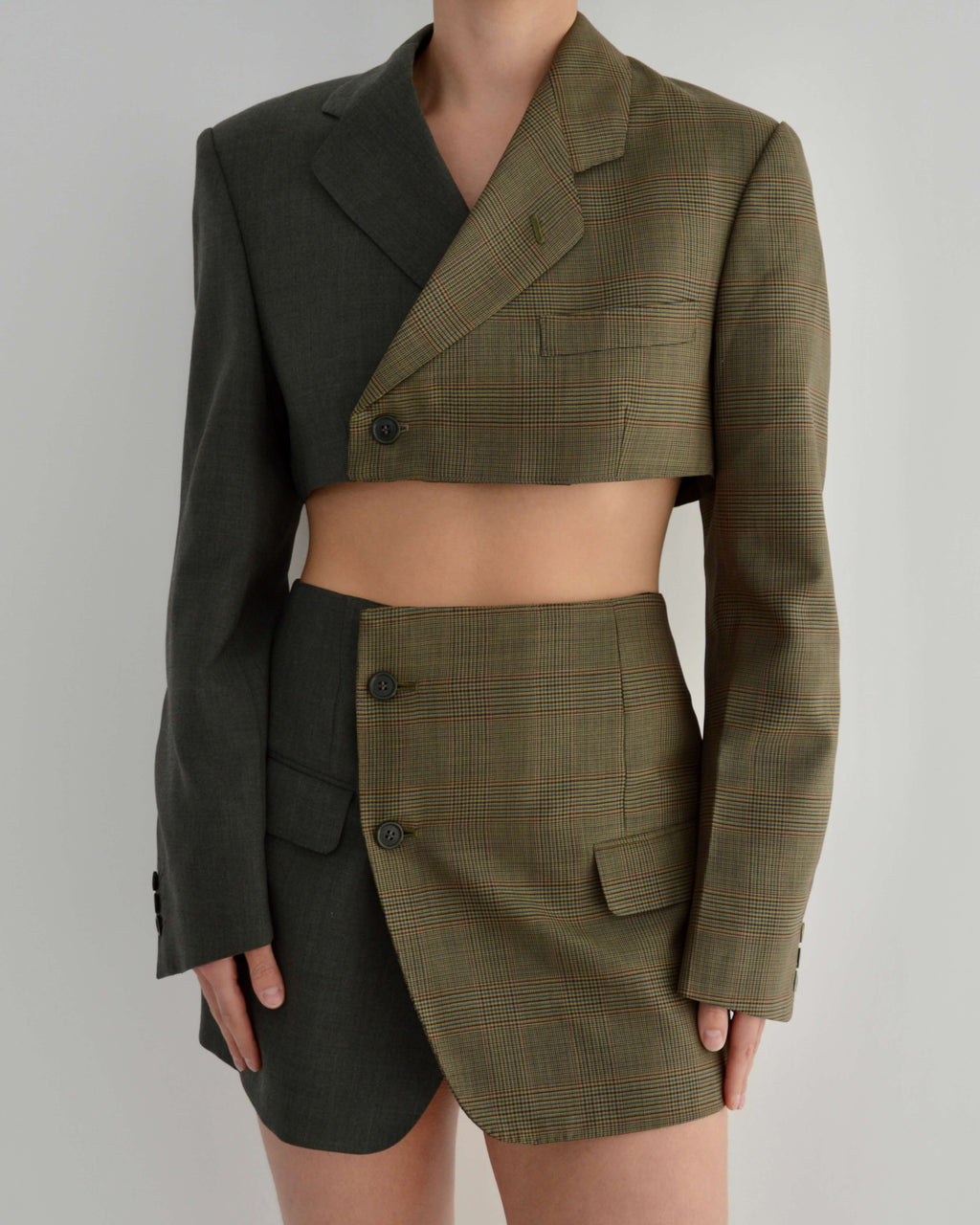 One-of-a-kind blazer set, hand-made from combining two men’s jackets into a two piece set. The cropped blazer is design for an oversized fit, as it comes from original menswear tailoring.